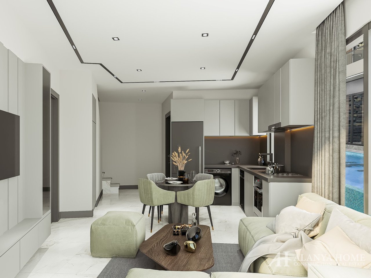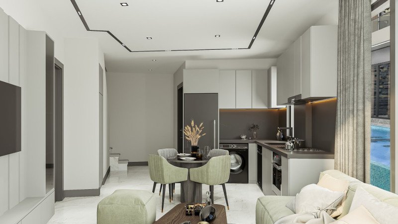 The project’s unique location allows residents to reach the crystal-clear waters of Kızılkule, Cleopatra, and Keykubat beaches within a few steps. Shared facilities, including a heated swimming pool, jacuzzi, and sauna, bring year-round vacation luxury to your home. The duplex penthouses feature bioclimatic pergolas, glass-enclosed private terraces, and heated jacuzzis, transforming Mediterranean views into a daily luxury ritual. Bosch air conditioning systems and Bosch underfloor heating ensure perfect comfort regardless of the season.