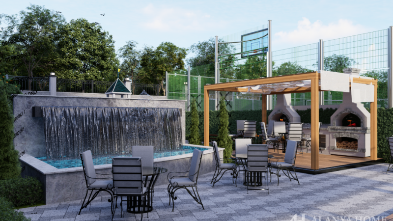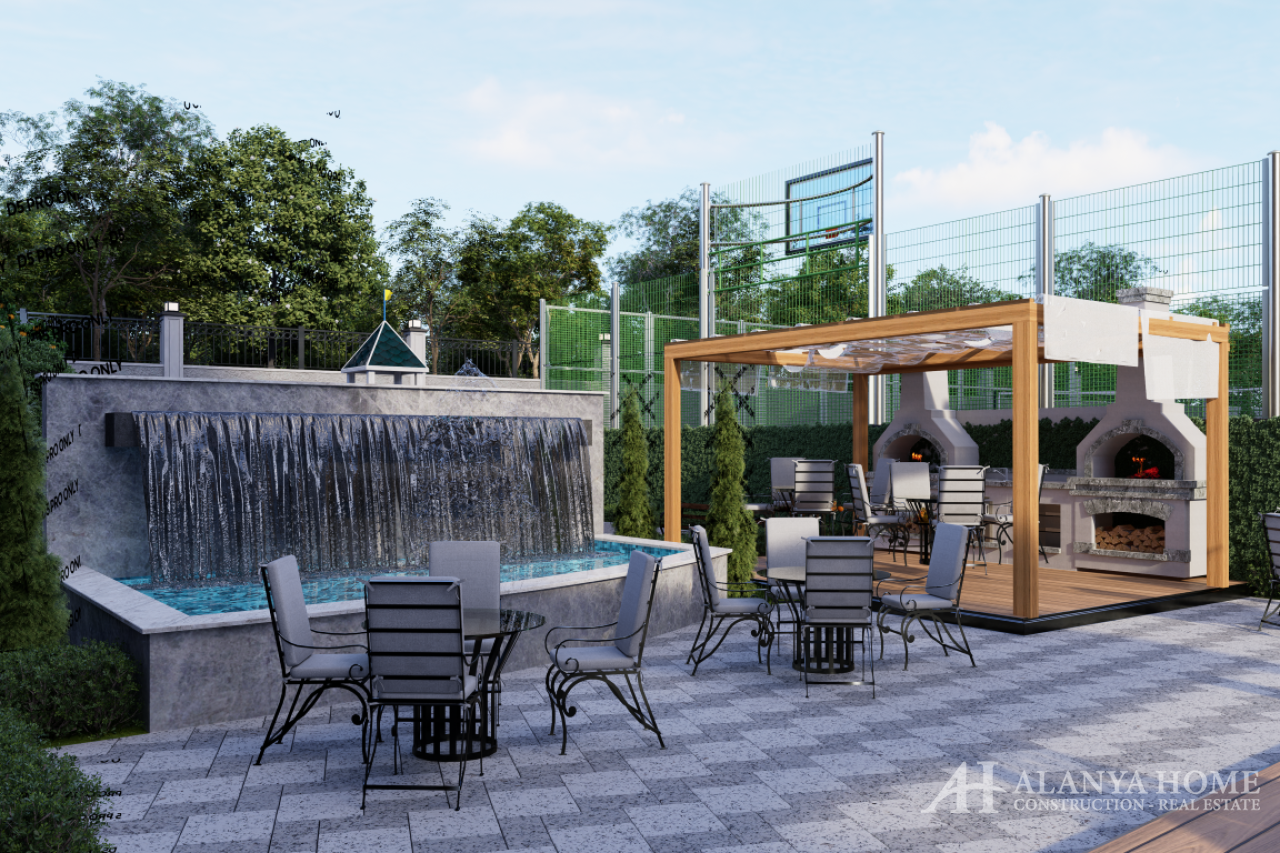 The project includes open and heated indoor swimming pools, jacuzzi, sauna, hammam, fitness center, children’s play areas, tennis court, aqua park, mini cinema, and barbecue areas. Additional facilities include 24/7 security, generator, double elevators, central water and booster system, fire alarm system, CCTV, and electric vehicle charging stations.
