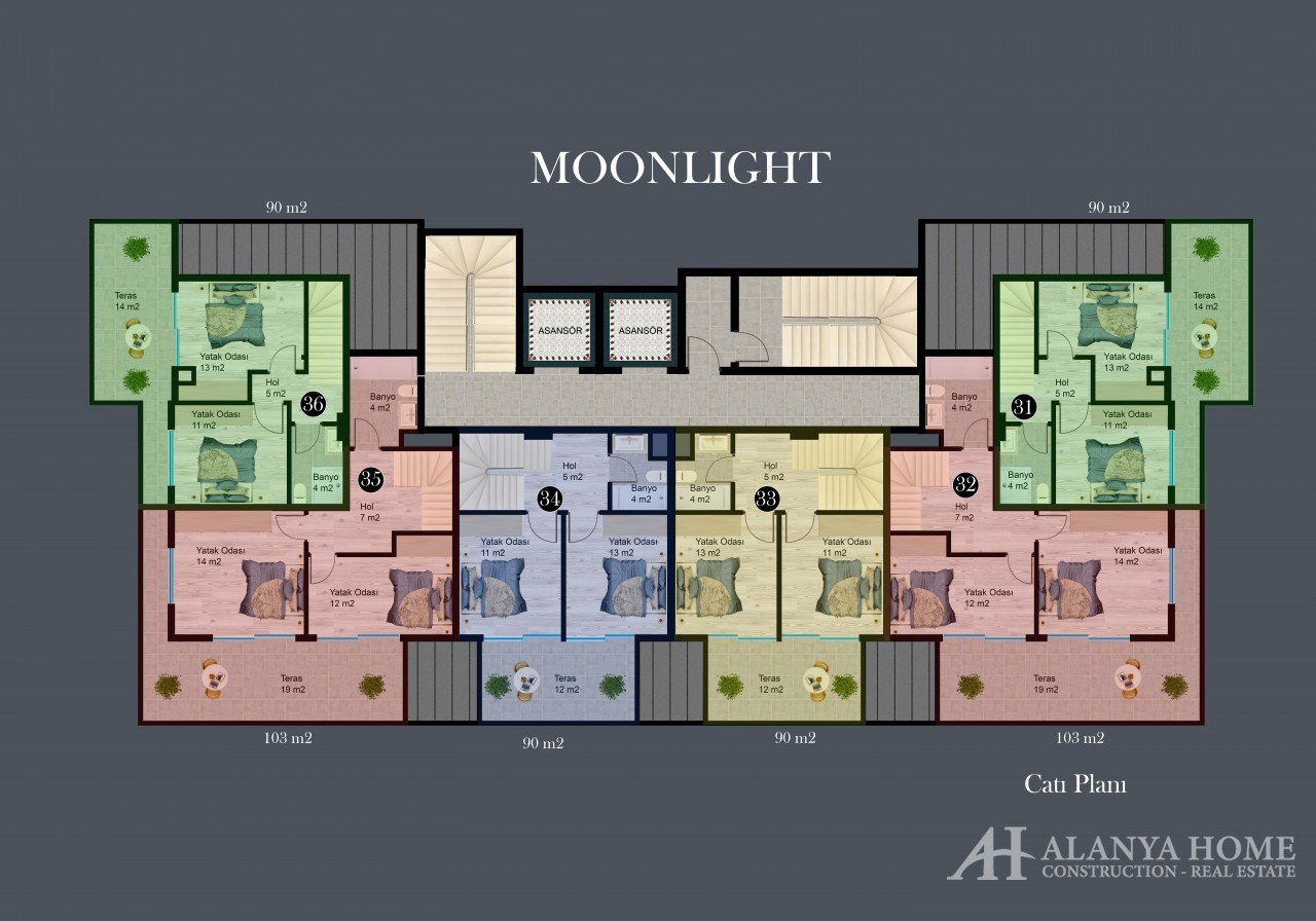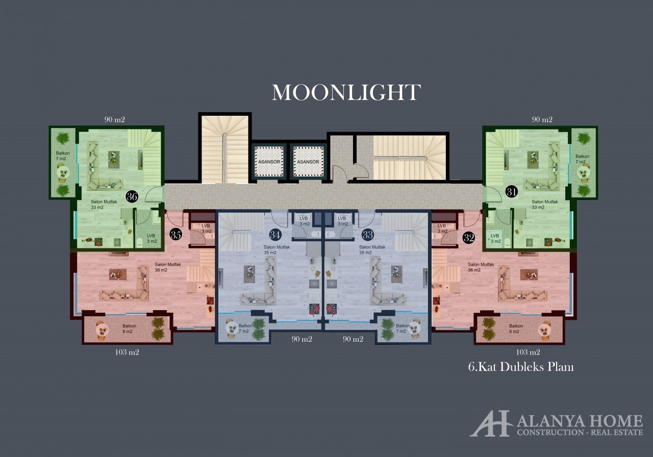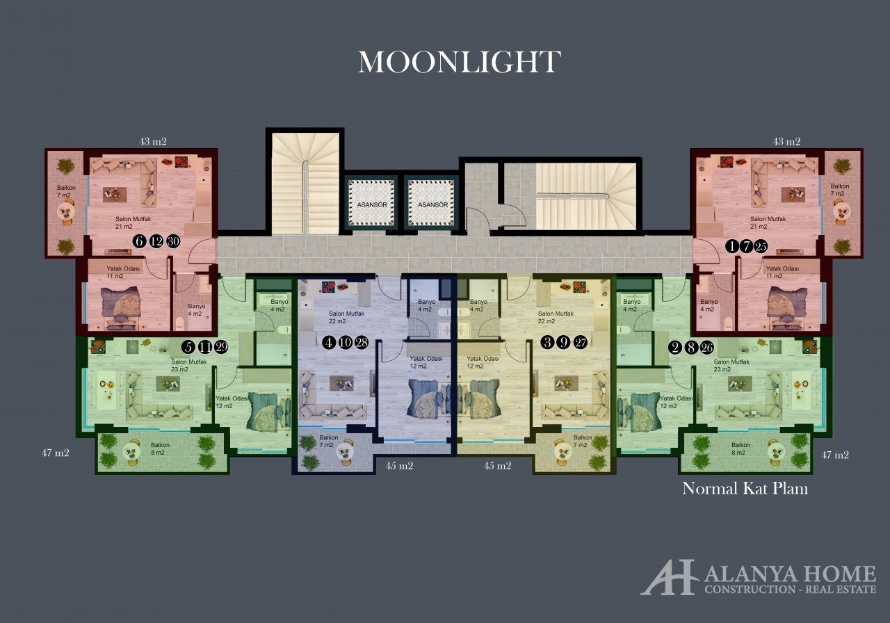 Moonlight Residence includes 1 + 1 apartments of ​​43-47 square meters and 2 + 1 duplexes ​​90-103 square meters.