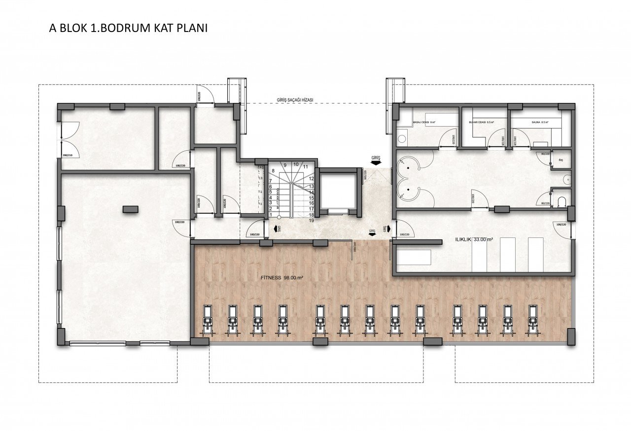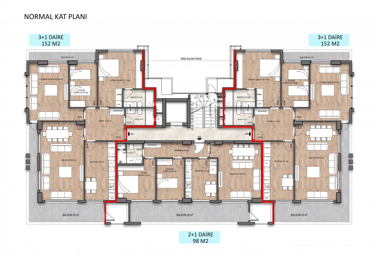 -Стальные двери, панельные двери в комнатах (кухня и гостиная со стеклом), пол плитка или паркет, детализированный потолок во всех комнатах, скрытая подсветка на потолках, шкафы для ванных комнат, кухонные шкафы из Hayglass или глосмакс, обогреватель для каждой квартиры, стекло душевая кабина ... В подъезде каждой квартиры будет гардероб.